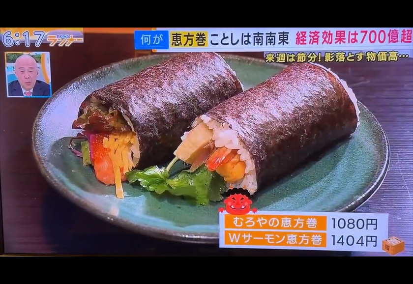 「むろやの恵方巻」「Wサーモン恵方巻」「びっくり!!玉手箱」が紹介されました。